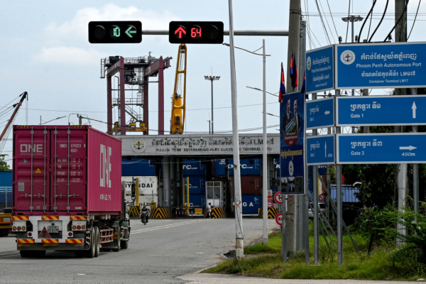 A truck transports a container toward the entrance of the Phnom Penh Autonomous Port on April 3, 2025. Southeast Asian countries with a significant trade surplus with the United States came in for harsh treatment, with Vietnam being hit with a 46 percent levy and Cambodia 49 percent. (Photo by TANG CHHIN Sothy / AFP)
