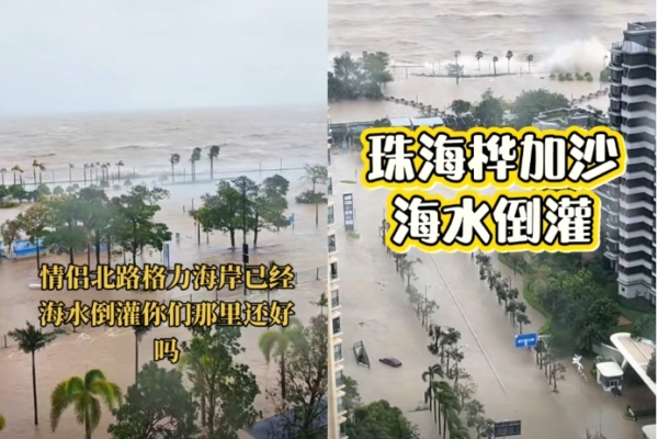 24日下午,多位珠海網民發視頻稱,珠海情侶北路格力海岸遭海水倒灌,「海岸公園被摧毀,海水灌滿道路、灌進住宅區」。