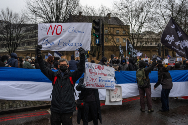 圖為2025年2月8日,英國倫敦,來自香港、西藏、維吾爾族、中國異見人士和其他常駐組織等不同僑民的抗議團體,在中共大使館擬建地點舉行示威活動。 (Carl Court/Getty Images)