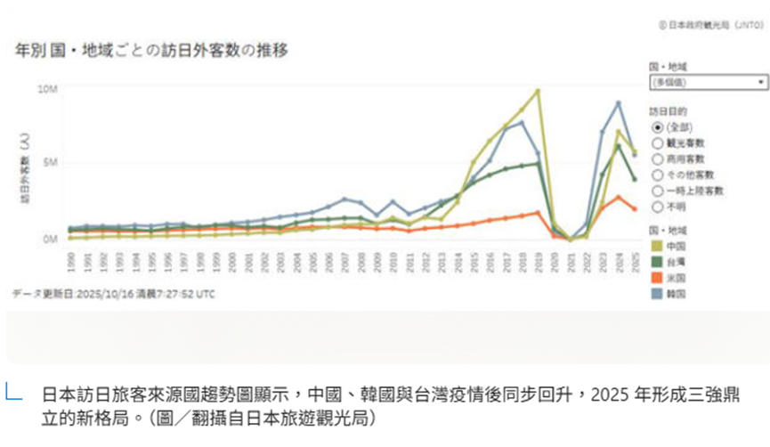 林氏璧指出,尽管中国游客的确在暑假后大幅超车,单月突破百万,但回顾疫情前2019年,中国曾占访日旅客三成、达959万人;如今比例虽仍高,但依赖度已大幅下降。甚至在2023年中国旅客尚未完全回流时,日本全年国际旅客就已回到2506万人,「没有依赖中国,日本也站起来了。」