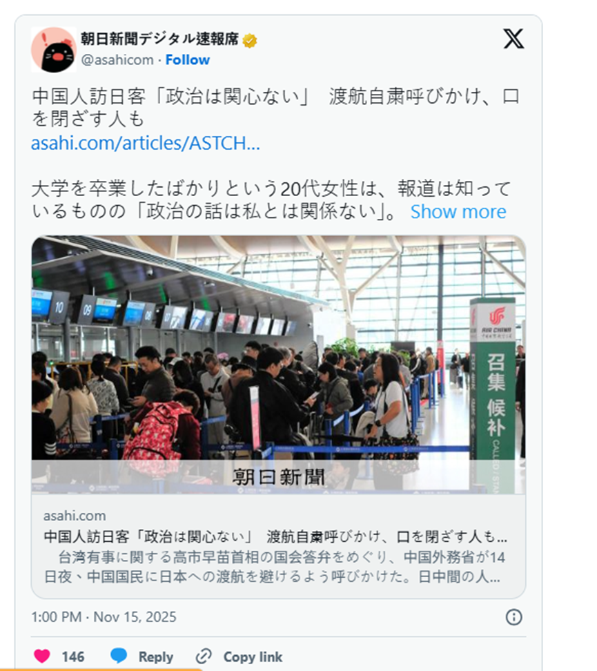 据朝日新闻报导,其记者11月15日10时前往上海浦东机场,看到大阪航班柜台前已排起长长队伍,旅客手持红色中国护照、拖着行李箱,现场甚至充满家族笑声与年轻情侣的交谈声,几乎全是前往日本观光的旅客。