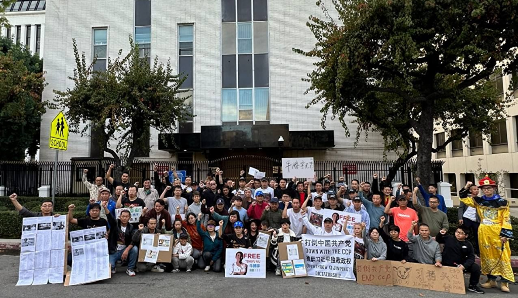 2023年12月16日,大洛杉磯地區的中國民主黨成員到中領館前抗議中共非法關押迫害牛騰宇。(界立建提供)