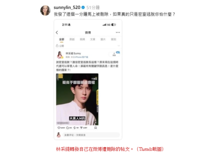 台湾女星林采缇24日在Threads透露,当天凌晨她在微博转发于朦胧疑似生前遭到施暴的爆料影片,并表示:「说密室逃脱?谁信密室迷脱长这样?原来现在这个时代可以草菅人命,可屏蔽所有关键词跟讯息!这是什么样的国家?」