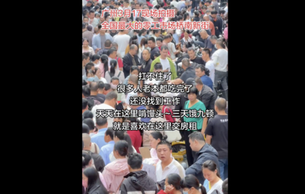 有博主发布视频显示,3月下旬,全国最大的零工市场之一——广州桥南新街,找工作的人扎堆,场面令人惊叹。
