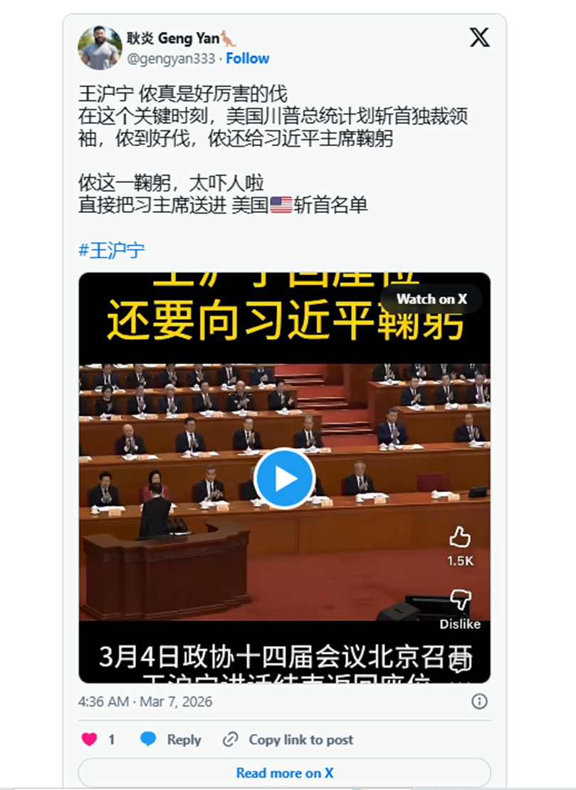 港媒《明报》、日媒《日经亚洲》及《大纪元时报》等媒体报导,4日举行全国政协开幕式时,政协主席王沪宁在发表工作报告后返回座位,在走到习近平右前方时,短暂停顿、双手下垂向习低头弯腰致意,习则微微点头回应。这段画面在海外社群引发网友讨论,「标准的主子和奴才」、「做了三朝国师……到这朝虽然级别更高了,但奴性也更重了,恐怕也是由不得他了」,认为这不仅是礼节,还是公开宣示臣服。