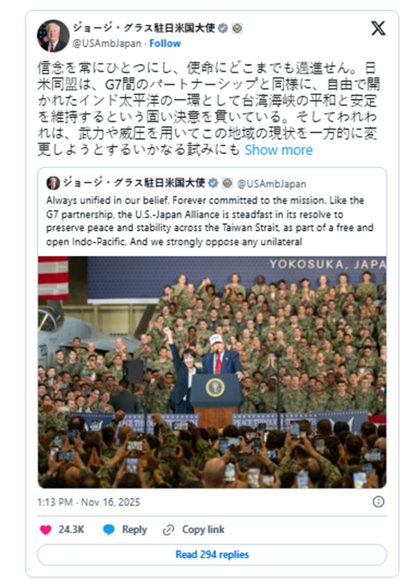 今(17日),葛拉斯(George Glass)又再度发文表示,「我们始终秉持共同信念,永远坚守使命。与七大工业国(G7)集团伙伴关系一样,美日同盟坚定不移地致力于维护台海的和平与稳定,做为自由开放的印太地区的一部分。我们强烈反对任何单方面企图藉由武力或胁迫方式改变区域现状的行径。」同时附上美国总统川普与高市早苗上月在横须贺海军基地登上美国航空母舰「乔治华盛顿号」的照片。