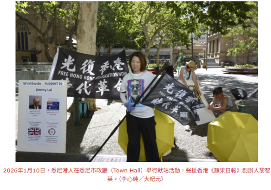 在《苹果日报》创办人黎智英宣判刑期前夕,港人团体「新州自己人」(NSW Hong Kong Friends)于1月10日下午5点,在悉尼市政厅前举行默站活动,声援并要求释放黎智英。