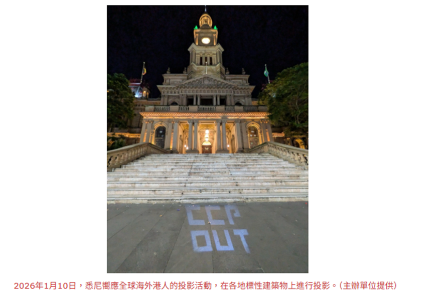 同日晚上,悉尼向应全球海外港人的投影活动,在悉尼各个地标性建筑物上投影「自由香港」(Free Hong Kong)及「中共下台」(CCP Out)的字眼。