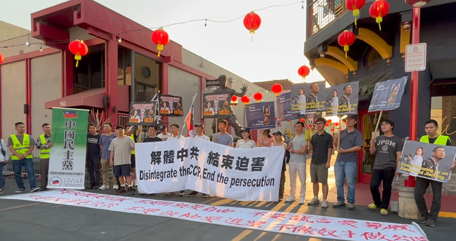 2024年6月15日,洛縣華人在洛杉磯中國城集會,抗議中共迫害獨立記者黃雪琴和勞工維權者王建兵。(新唐人提供)