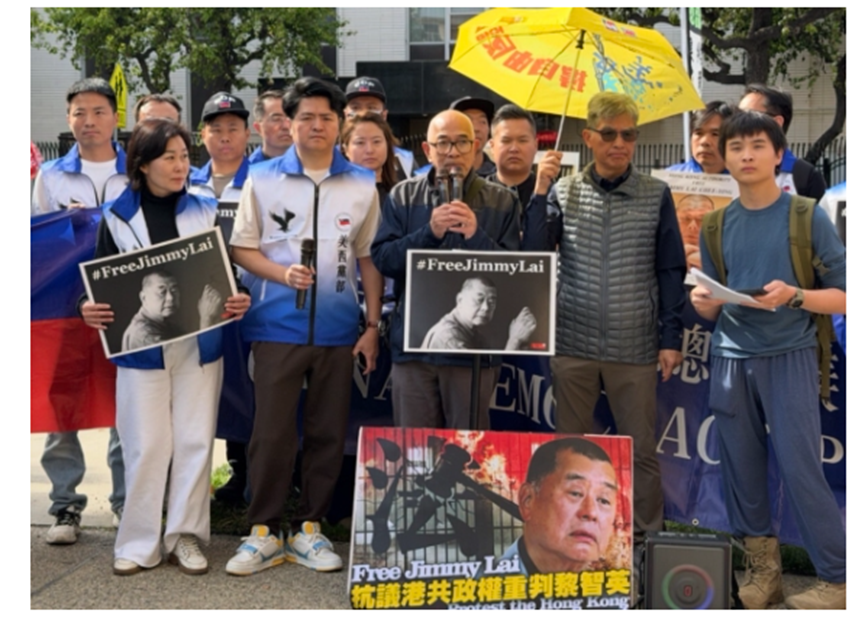 14日当天除洛杉矶外,旧金山和圣地亚哥也同步举行了抗议集会。中国民主党联合总部美南和美西总部的多名成员在集会上发言,谴责中共利用黎智英一案,破坏香港的言论、新闻、正常的国际交流以及交往等自由。