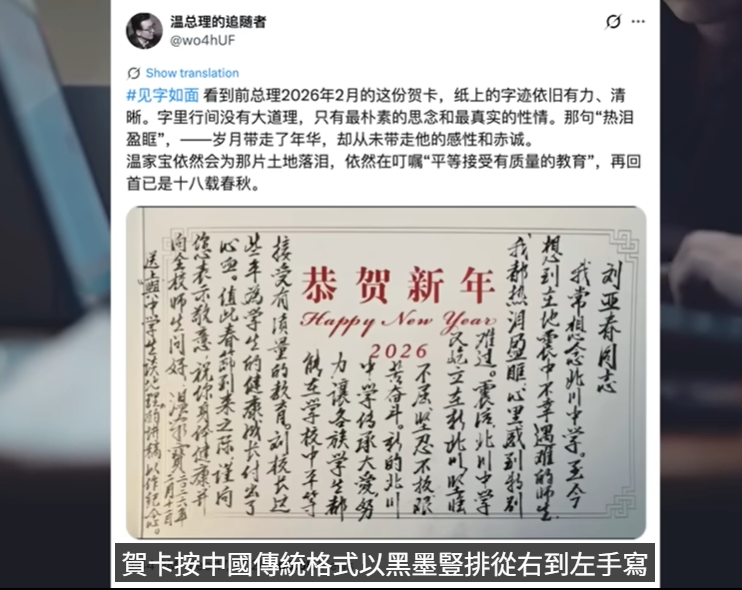 #温家宝 #新春贺卡 #刘亚春 #汶川地震 #北川中学 #手写信 #政治体制改革 #社会公平正义 #文革回潮 #改革开放 #江泽民 #薄熙来 #温州动车事故 #救人第一 #中共高层博弈 #中共官员 #海外舆论 #中国政治 #政治担当 #媒体包装 #公众愤怒 #人权事件 #中国历史事件 #体制内压力 #三退