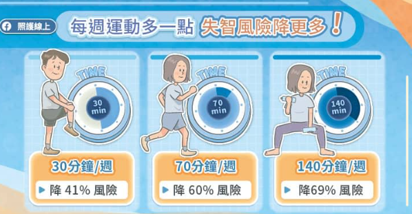 研究发现,每星期中度运动至剧烈运动的时间长短,与失智风险相关。