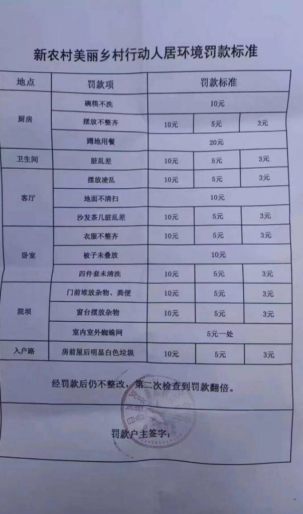 综合报导,近日,网路疯传一张「新农村美丽乡村行动人居环境罚款标准」。根据内容显示,该标准涉及厨房、卫浴、客厅、卧室等场合,列举了14种「脏乱差」行为,如「碗筷不洗罚10元」、「蹲地用餐罚20元」等。此外,「衣服不整齐」、「被子未叠放」、「地面不清扫」等也都在罚款范围内,且特别强调「经罚款后如不整改,第二次检查将导致罚款金额翻倍」 。