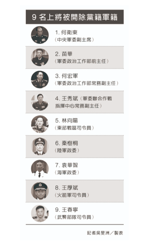 中共国防部17日公布,此9人严重违反中共的纪律,涉嫌严重职务犯罪,数额特别巨大,性质极为严重,影响极其恶劣,被给予开除党籍处分,此前已经开除军籍。