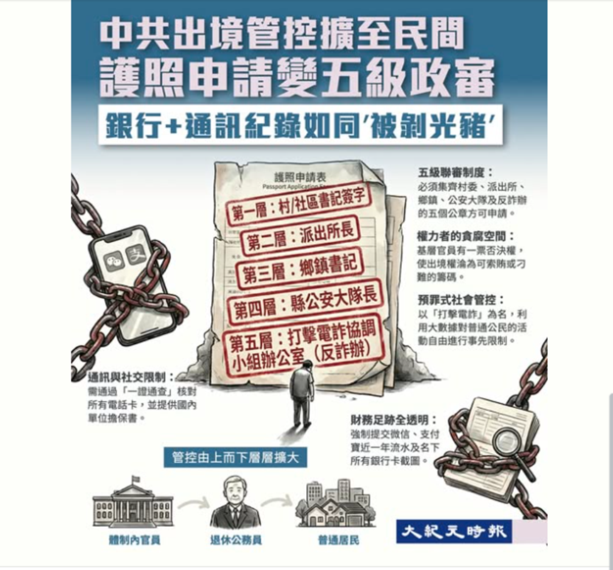 根据近期流出的文件与媒体报导,湖南武冈等地出现「五级政审」的护照申请制度:申请人需经过村(小区)、乡镇、派出所、公安局及反诈办等五个层级逐一盖章审核,才能取得出境资格。