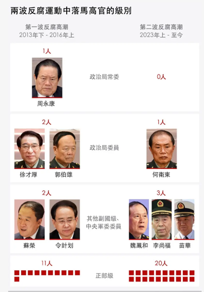 中国国防部此前通告称,这些人「严重违反党的纪律,涉嫌严重职务犯罪,数额特别巨大,性质极为严重,影响极其恶劣。」