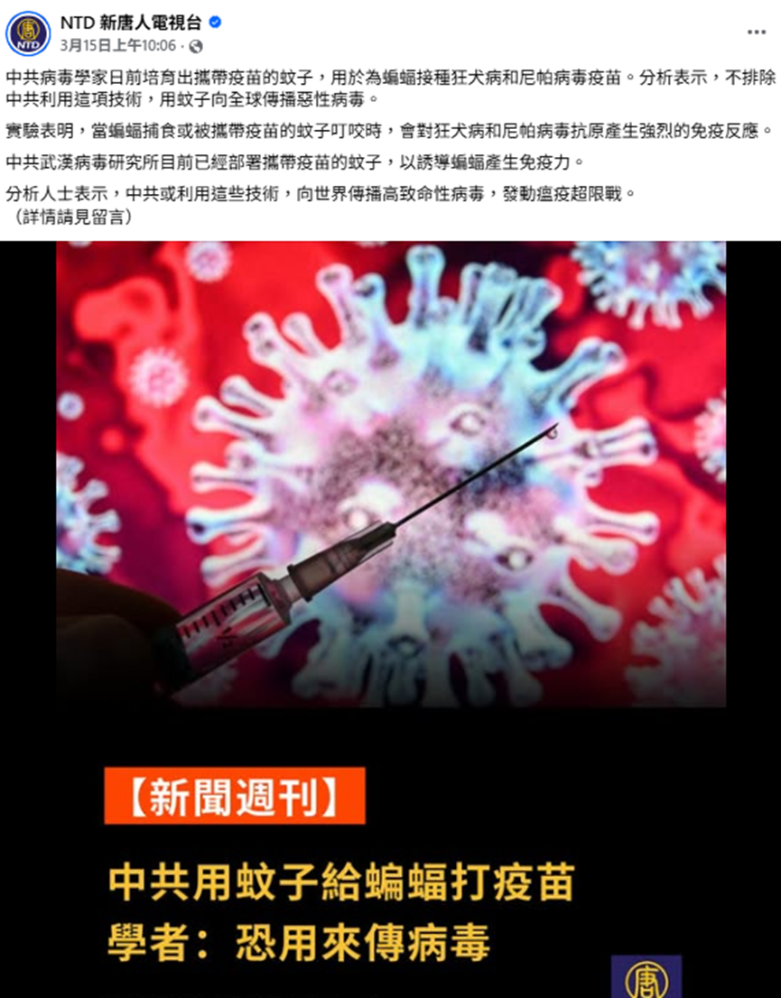 根据报导,研究人员已成功让蚊子携带疫苗,用于对蝙蝠接种狂犬病与尼帕病毒疫苗。