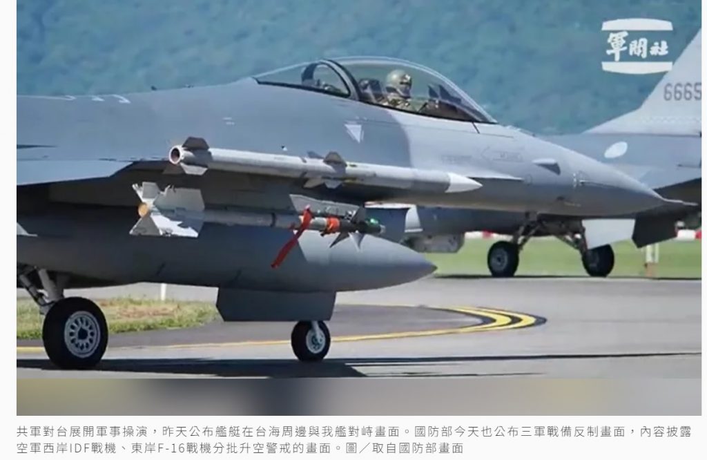 共軍對台展開軍事操演,昨天公布艦艇在台海周邊與我艦對峙畫面。國防部今天也公布三軍戰備反制畫面,除披露海軍成功級田單軍艦監控中共徐州號飛彈護衛艦的畫面外,同時也公布空軍西岸IDF戰機、東岸F-16戰機分批升空警戒的畫面,顯見共軍此波軍演部隊在台灣海峽、東部海空域同時出沒。