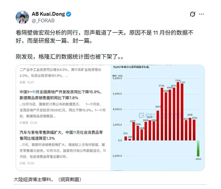 更有经济博主反映:即使是单纯的数据图,只要没有正面评价,都可能遭到下架或限流。如此现象让许多经济研报与分析内容在抖音上无法公开存在,进一步缩减了社会对经济现状的透明讨论空间。