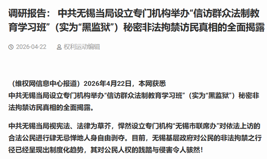 2026年4月,一份由维权团体披露的调查报告,将无锡长期存在的灰色机制再次推上台面——所谓「信访群众法制教育学习班」。