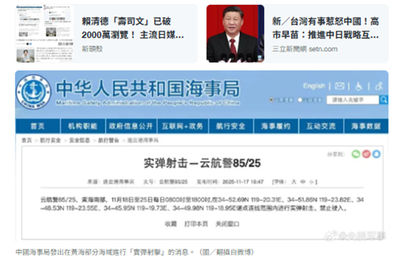 事实上,中日关系陷入僵局后,中国的确动作频频,禁水产、限制旅游不稀奇,甚至试图以武力威吓,根据《财联社》报导,中国海事局网站指出,11月18日~25日,每日上午8时至下午6时,在黄海南部部分海域将进行实弹射击,被认为是冲着日本而来。