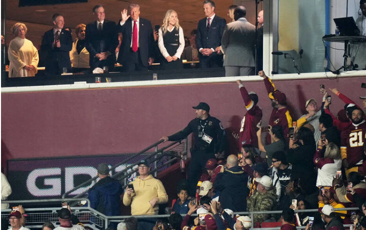 据 《美联社》报导,美国总统川普9日莅临马里兰州,观看华盛顿指挥官队对阵底特律雄狮队的国家美式足球联盟(NFL)例行赛,成为自1978年卡特总统以来,近半世纪(47年)首位出席NFL例行赛的现任总统。然而,当球场的大屏幕在比赛上半场结束前,播出他与众议院议长琼森(Mike Johnson)在贵宾室内的画面时,现场嘘声四起。