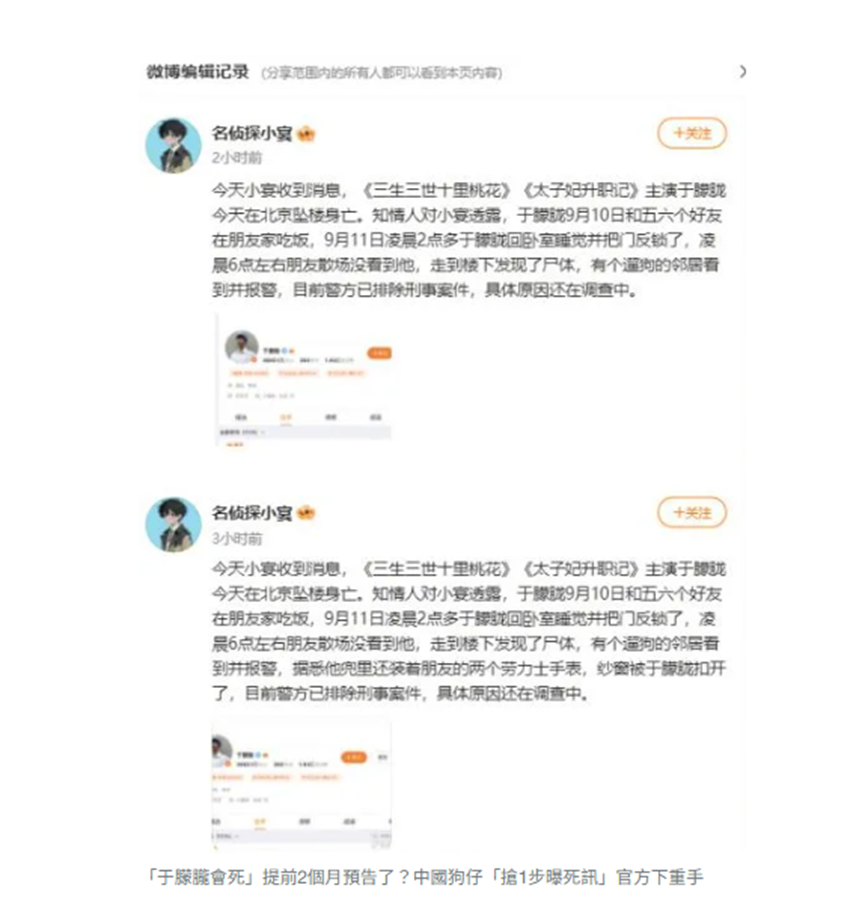 37岁中国男星于朦胧9月11日在北京坠楼身亡,中国警方事后以「酒后失足意外」快速结案,但案件疑点重重,让外界疯猜背后恐另有隐情。近期就有人翻出一则早在今年7月就流传的贴文,质疑「于朦胧之死」疑似提前2个月就被暗示了;另外,一位中国狗仔抢先官方一步、爆出于朦胧死讯,超惨下场也曝光了。