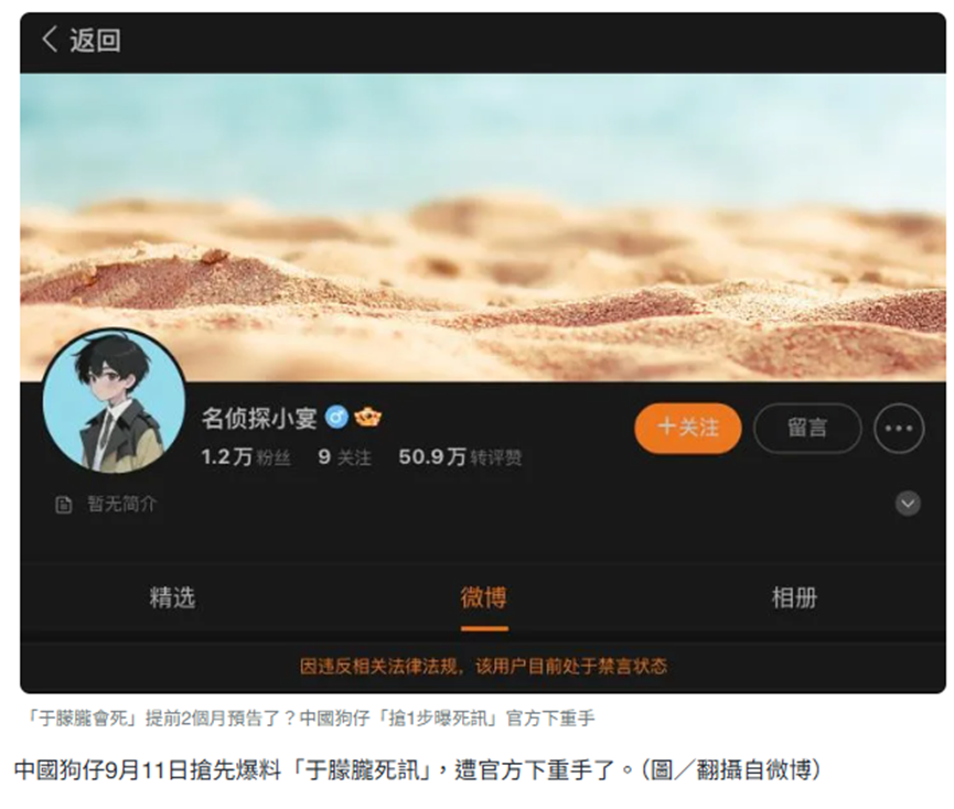 而如今再查看该微博账号,最后贴文停留在9月11日当天,但爆料「于朦胧死讯」的贴文已神秘消失,官方也下重手称该用户「违反相关法律法规,目前处于禁言状态」。种种超鬼细节让不少中国网友质疑「超像有人想压消息!」、「有人动了手脚?」。