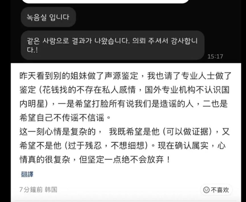 近期网络流出的录音文件中,于朦胧临终前痛苦哀嚎的声音震撼全网络,上个月(9月)26日有中国专业机构率先进行声纹比对,结果显示录音中的声音与于朦胧高度一致。还有网友为了避免争议,特地委托韩国专业团队,且不认识中国国内明星的人来鉴定再度分析,「一是希望打脸所有说我们是造谣的人,二也是希望自己不传谣不造谣」结论同样指向于朦胧本人。