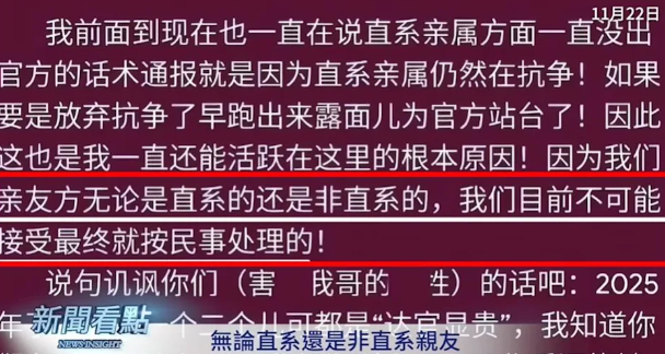 撰写人表示自己有医学背景,质疑「于朦胧工作室做为一个第三方的私人商业机构,有什么资格来通报自然人的身亡?」,坦言从来没有看过有私人企业去通报死亡过,信内透露,目前直系亲属还没有官方的通报,就是因为直系亲属仍然在抗争当中」,强调不论直系或者非直系亲友,都不可能接受案件最后以民事处理,痛批「这是条人命,杀人偿命天经地义,要知道在所有血海深仇中,『命案』是被排到最前面的!你们这些狗腿子营消耗也会被我们开盒的,我们宁可杀错也绝不放过,所以你们最好晚上庆幸自己能睡得着吧」