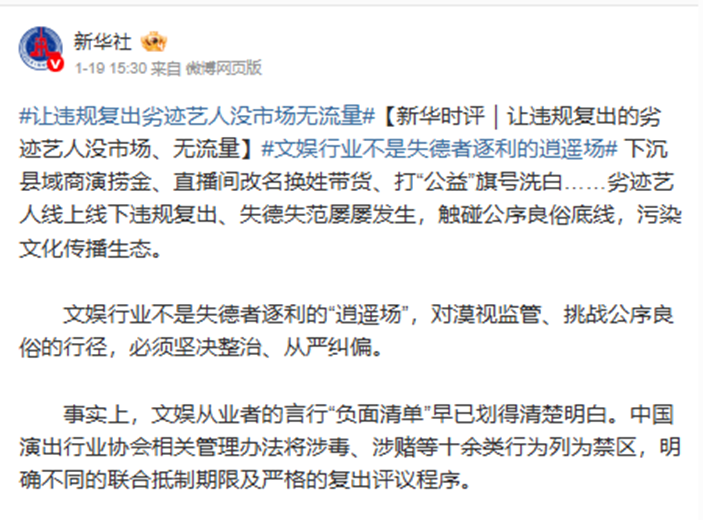 根据《新华社》评论强调,文娱产业不是失德者牟利的避风港,相关行径已触碰公序良俗底线,也对文化传播环境造成污染。文章分析,乱象屡禁不止的关键,在于部分从业者唯利是图,有些平台仍抱持流量至上的思维,加上在线与线下监管存在落差,使少数艺人得以利用制度缝隙规避查核,转往信息相对封闭的基层市场活动。同时,「饭圈文化」的推波助澜,也助长不良风气在部分粉丝群体中蔓延。